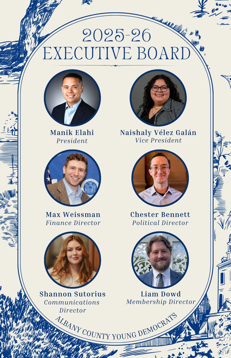 Several of our members hold statewide offices within the NYS Young Democrats, extending the Capital Region’s leadership and excellence across the Excelsior State.